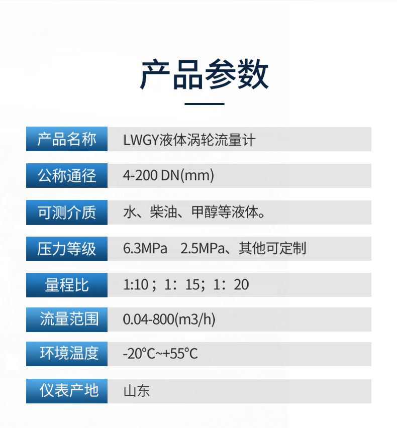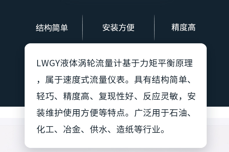 LWGY系列液體渦輪流量計基于力矩平衡原理,屬于速度式流量儀表。傳感器具有結(jié)構(gòu)簡單、輕巧、精度高、復(fù)現(xiàn)性好、反應(yīng)靈敏,安裝維護(hù)使用方便等特點。廣泛用于石油、化工、冶金、供水、造紙等行業(yè),是流量計量和節(jié)能的理想儀表。