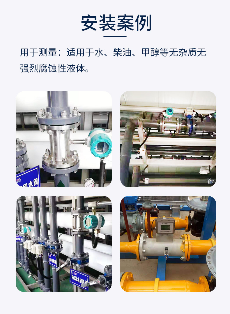 可測介質(zhì):水、燃油、油、食用油、柴油、汽油、導(dǎo)熱油、液壓油、煤油、焦油、甲醇、白酒、啤酒、酒精、果漿、糖漿等粘度較低的潔凈液體。